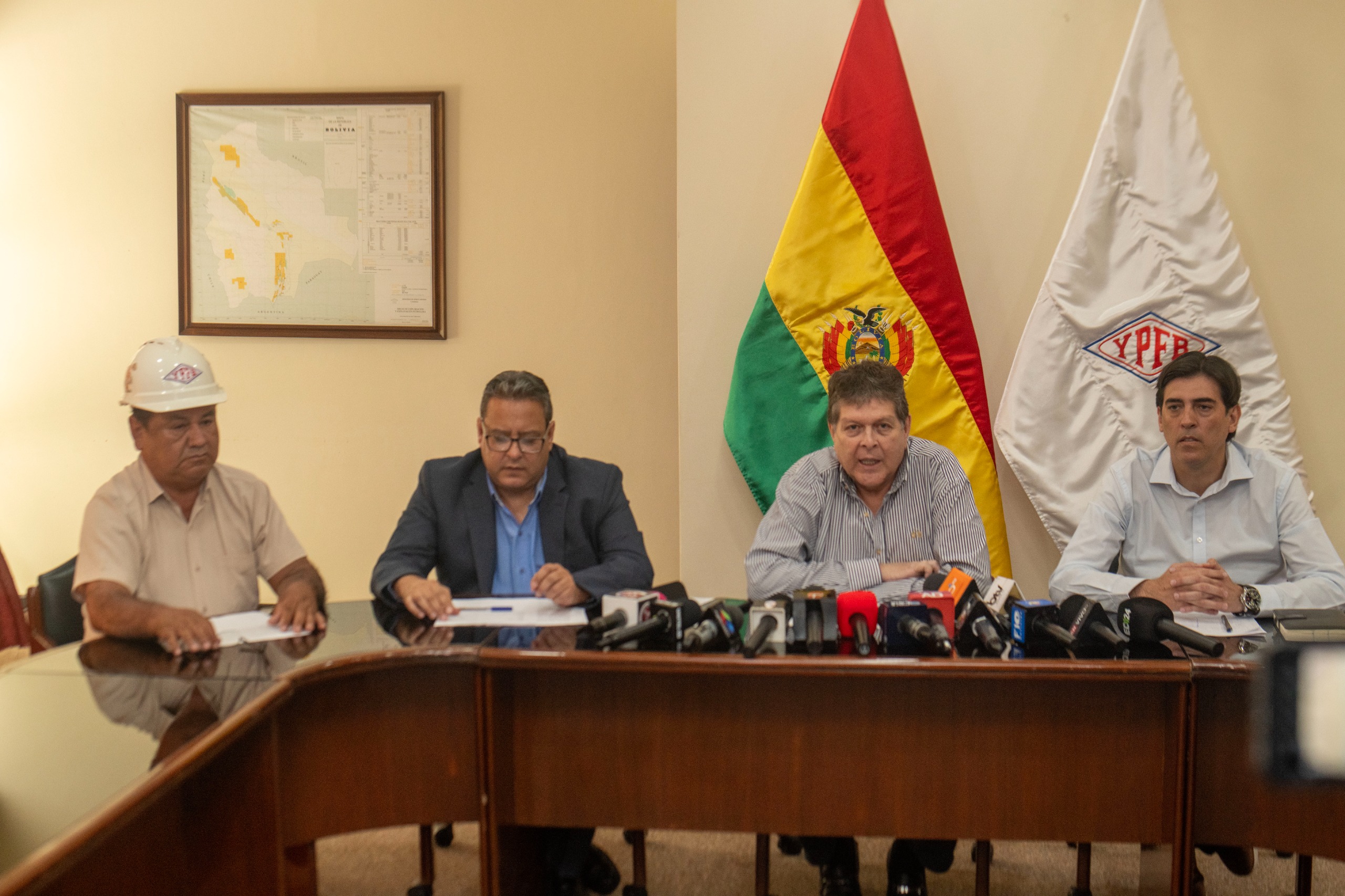 Junto al ministro de Hidrocarburos y Energías, Marcelo Blanco y el nuevo presidente de YPFB, Sebastián Daroca, el ministro Zamora visitó por primera vez las instalaciones de la empresa estatal en Santa Cruz. Luego, dieron una conferencia de prensa.
